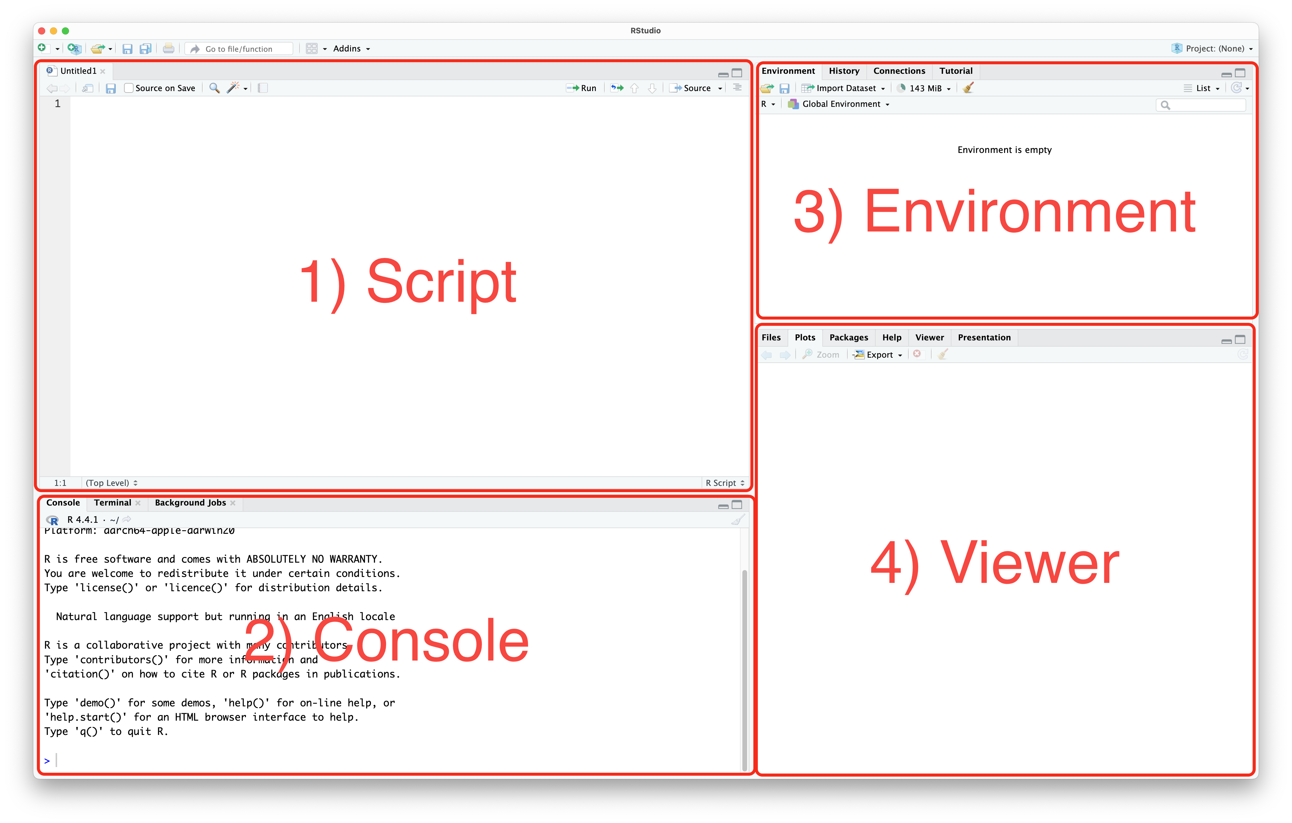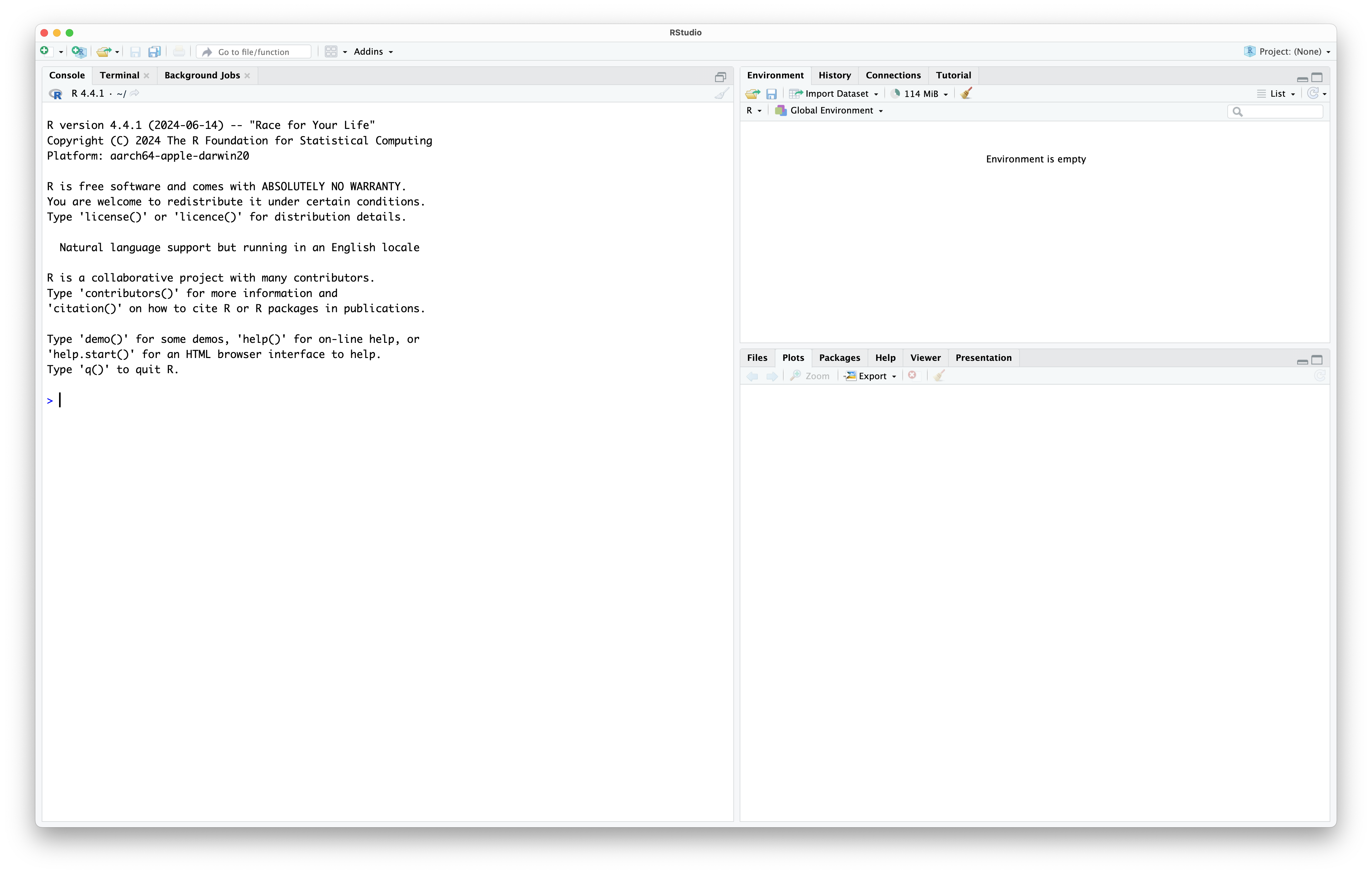 Once you have downloaded both R and RStudio, open RStudio. Your installation of R should be automatically detected, and you will be greated with an interface that looks like this: