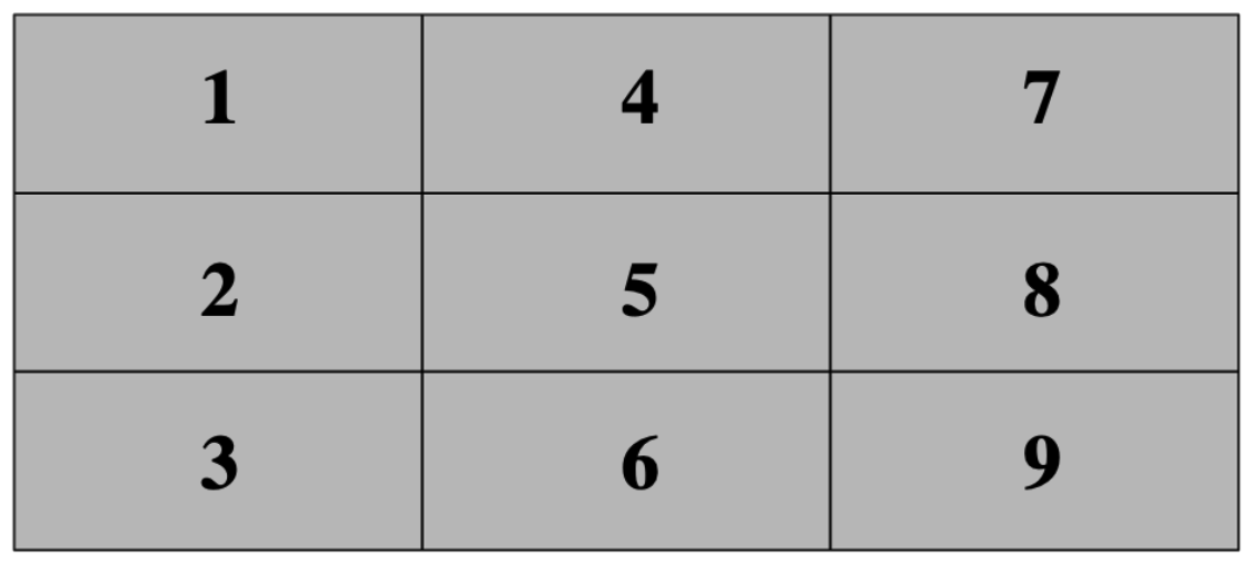 For the sake of simplicity in programming, we replaced X and O with colours (black and white) that each player can assign when their turn is due. The matrix is initially empty (coloured in grey, meaning that no player has used that cell yet) and each cell in the matrix is numbered in the following way: