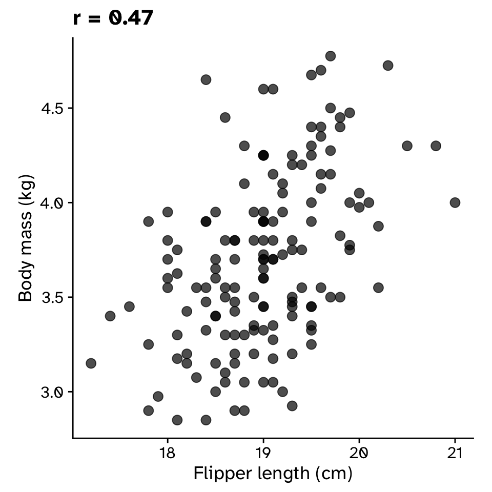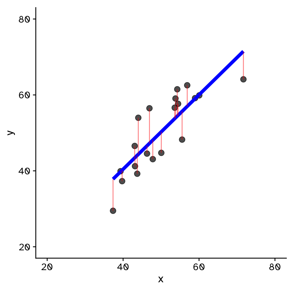 Coefficient of determination (\(r^2\)): \[ r^2 = \left(\frac{\sum_{i=1}^n (x_i - \bar{x})(y_i - \bar{y})}{\sqrt{\sum_{i=1}^n (x_i - \bar{x})^2} \sqrt{\sum_{i=1}^n (y_i - \bar{y})^2}}\right)^2 \]