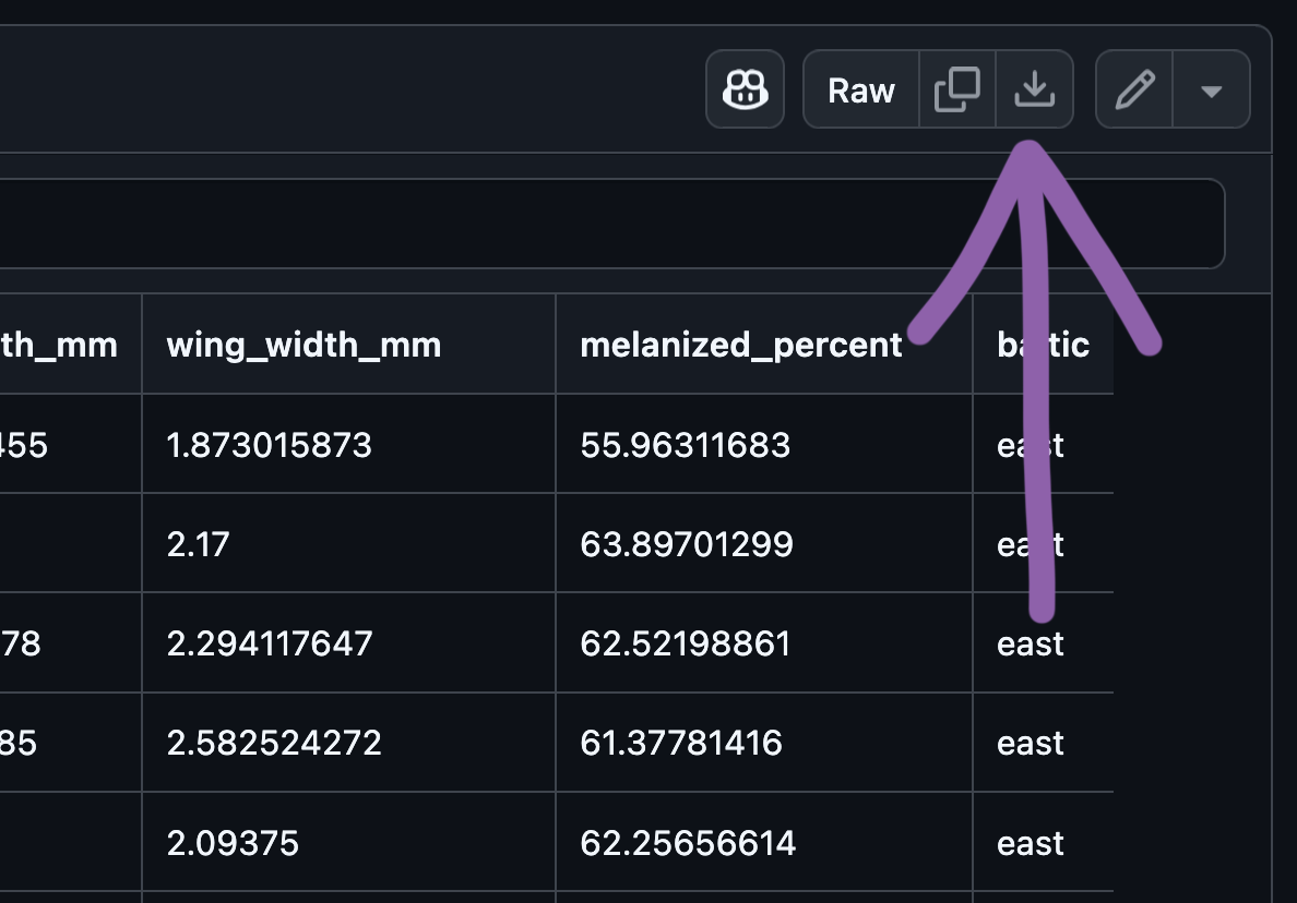 We will now load the tephritis_phenotype.csv data file that you downloaded earlier. A .csv file is a file that stores information in a table-like format with Comma Separated Values. A typical .csv file will look something like this: