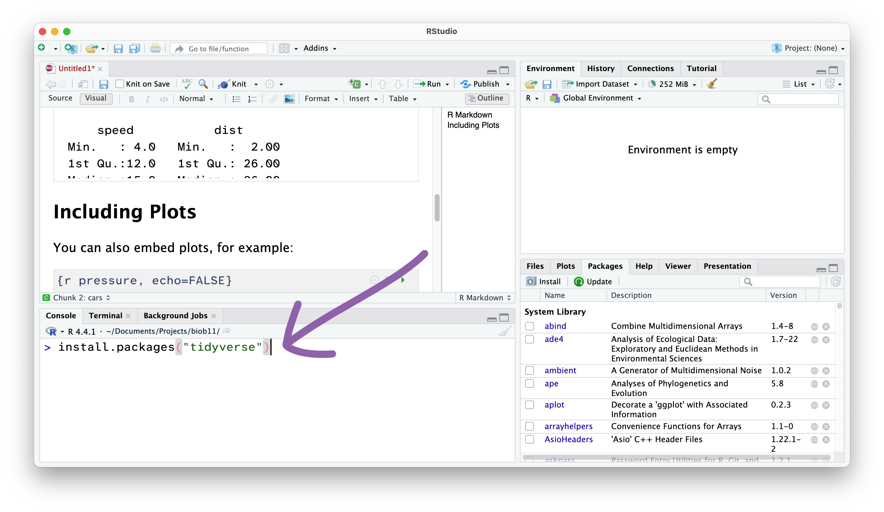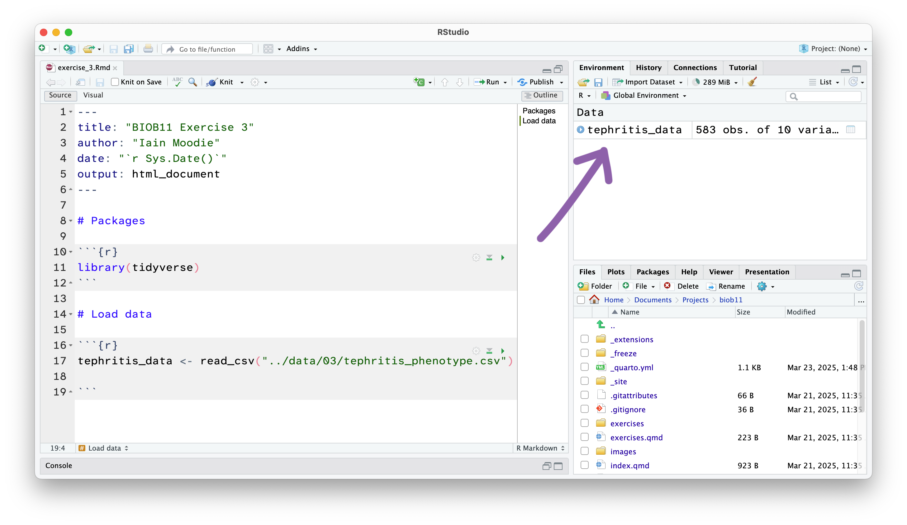 This will open the RMarkdown document with some example text and code. If you followed the Getting familiar with R set of execises, you’re already familiar with Rmarkdown documents, as that page behaves exactly like one! They allow you to mix code “chunks” with text and images. Sort of like a powerful word document. We will use RMarkdown documents exclusively in this course.